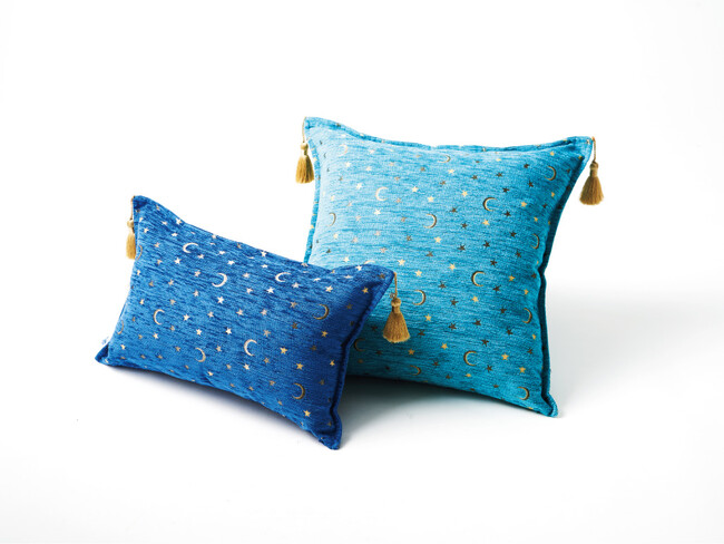 鮮やかなブルーの生地にトルコ国旗のシンボルでもある”月と星”をデザインしたクッションです。