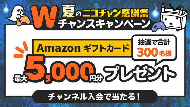 キャンペーン期間中、月額330円(税込)以上のニコニコチャンネルに1つ以上入会してご応募いただくと、抽選で合計300名様にAmazonギフトカードが当たります。