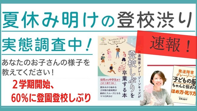 こんにちは。発達グレーゾーンの困りごとを大人に持ち越さない、5年かかっても見つからなかった悩みの解決方法が5分で見つかることを目指す「パステル総研」です。パステル総研では発達障害・グレーゾーンの園児・小学生・中学生をもつお母さんを対象に夏休み明けの2学期開始直後、お子さんの登園・登校しぶりに悩んでいるかアンケート調査を実施しました。