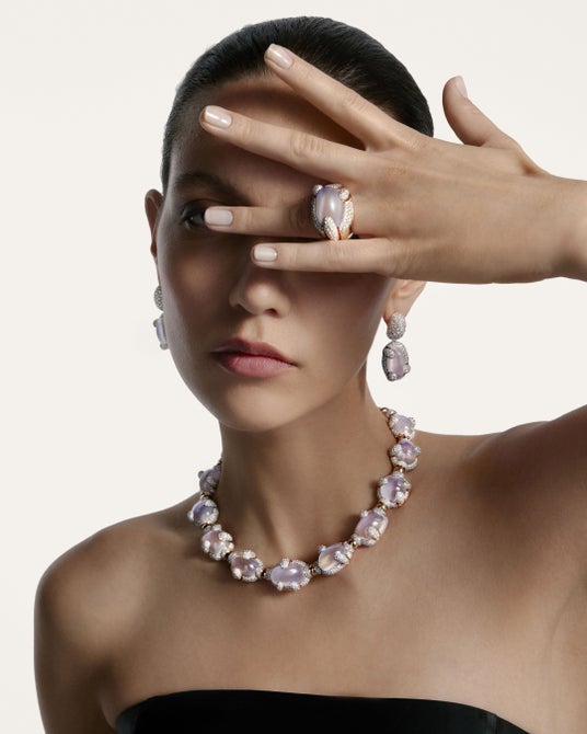 Moonstones-ミラノの街をたびたび包み込む霧にインスピレーションを受けたこのMoonstonesは、メレダイヤモンドに照らされたムーンストーンの美しさを表現しています。ポメラートならではの精神が、11石のカボションを通して輝きます。合計211.50カラットものムーンストーンに、ホワイトダイヤモンドのパヴェを施したリンクをあしらったローズゴールドのチョーカー。ポメラートのシグネチャーであるプロングがそれぞれのストーンを包み込み、大胆でありながら洗練された輝きを放ちます。チョーカーを引き立たせる2種類のリングは、それぞれカボションカットのムーンストーン(1つは41.91カラット、もう1つは32.79カラット)を主役に据え、ローズゴールドにダイヤモンドをあしらったプロングで留めています。「Moonstones」のラインアップを締めくくる2種類のイヤリングは、オーバルカットのムーンストーンにダイヤモンドパヴェが施されたゴールドのディスクを冠しています。