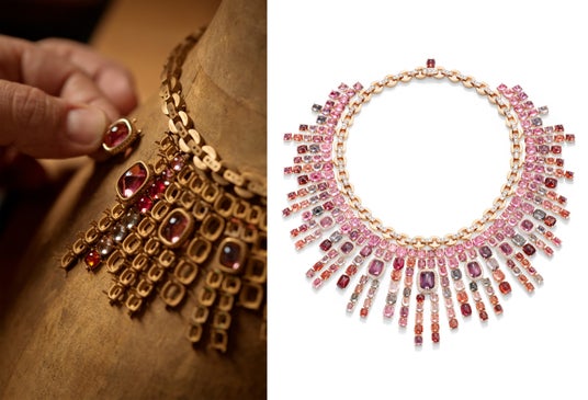 Spinelli di fuoco-ポメラートが作り上げた、胸元を飾る燃えるような色合いが美しいプラストロンネックレスは、メゾンのカラーストーンへの情熱を表現しています。この作品は、レッド、ピンク、パープル、バイオレット、グレー、オレンジ、アンバー、スカーレットという希少なスピネルを精緻に合わせ、ホワイトダイヤモンドを1列に配した斬新なローズゴールドのチェーンに包み込むように配しています。合計365カラットに及ぶ238ものカボションカットされた スピネルを、それぞれのストーンのために特別にデザインされた、クローズドセッティングとプロングセッティングの 両方を駆使したユニークな方法によって留めて、他にはない流れるようななめらかさを実現しています。この作品を完成させるのはマルチカラースピネルとホワイトダイヤモンドをあしらった2種類のイヤリングです。