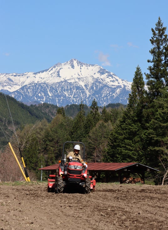 4月24日、笠ヶ岳を望む上宝町蔵柱の水梨勝郎さんの田んぼでは田起こし作業が行われていました。水梨さんは「今年は雪が多く、雪解けは遅いと思ったが、急に姿が見えて驚いた。今年もおいしい米を作りたい」と話されました。