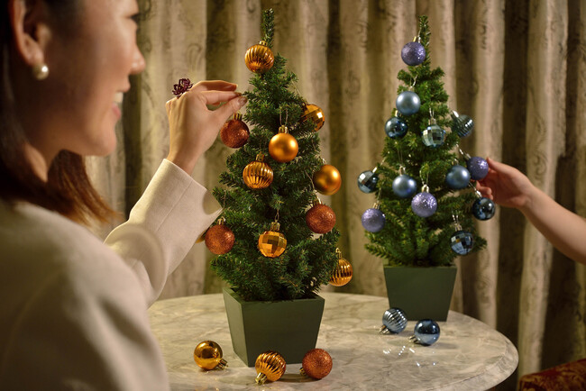 今回、「赤」「オレンジ」「黄」「緑」「青」「紫」「ピンク」「黒」の8色から、お好きな色をお一人様1色お選びいただき、選んだ色のオーナメントを約48cmの卓上クリスマスツリーに自分自身で自由に飾りつけをすることができます。