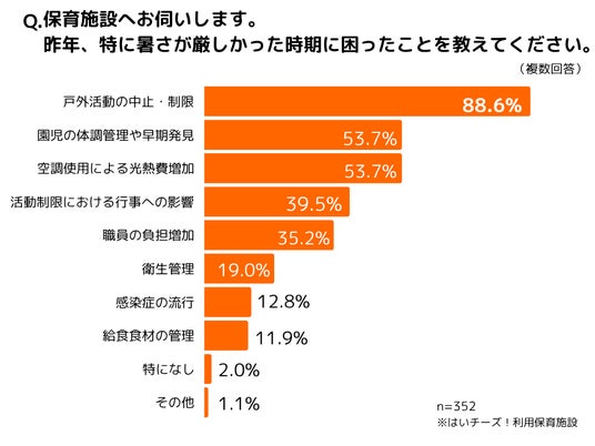 83.2%の保育施設が実施している「熱中症警戒アラートに応じた活動変更」により、88.6%の保育施設が「戸外活動の中止・制限」に困ったと回答しました。