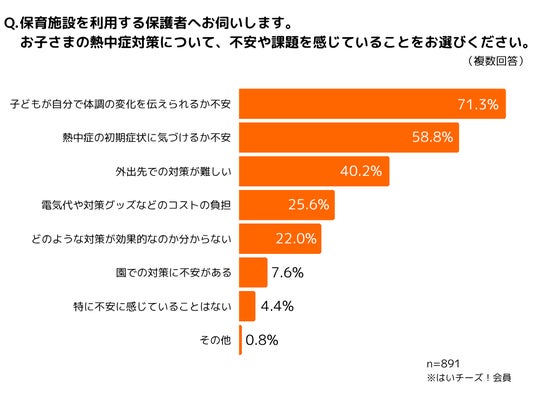 一方で、子どもの熱中症対策について保護者に不安や困りごとを聞いたところ「子どもが自分で体調の変化を伝えられるか不安(71.3%)」が最も多く、次いで「熱中症の初期症状に気づけるか不安(58.8%)」が続きました。この結果から、保護者は子どもの体調変化に気づく難しさや、子ども自身が不調を伝えられるかどうかに不安を感じており、異変を見逃してしまうことへの懸念が浮き彫りとなりました。
