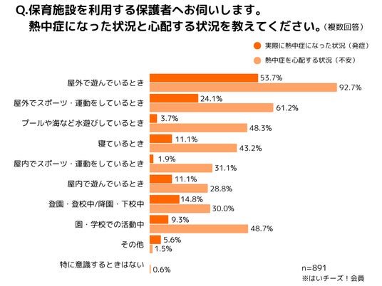昨年の夏にお子さまが熱中症を発症したと回答した保護者は、全体の6.1%に上りました。発症時の状況で最も多かったものは「屋外で遊んでいるとき(53.7%)」、次いで「屋外でスポーツ・運動をしているとき(24.1%)」となり、屋外で過ごす時間にリスクがあることが分かります。