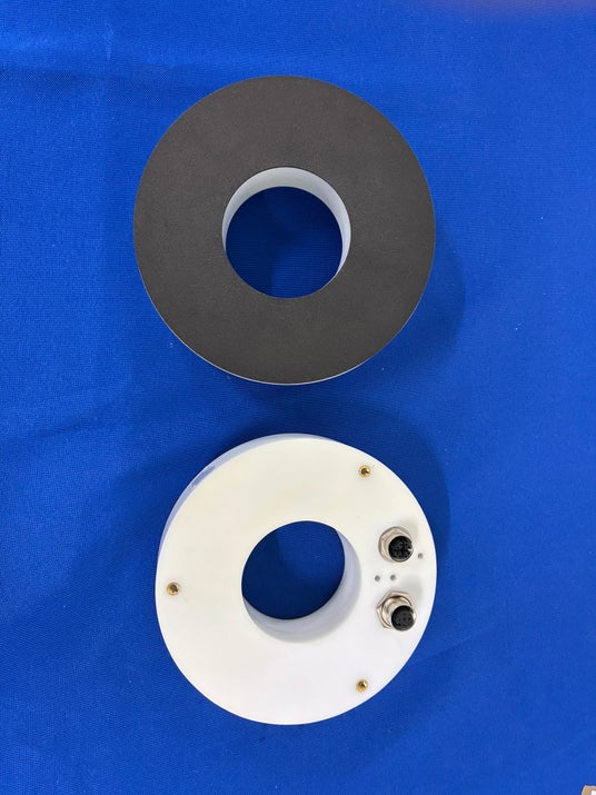 B&PLUSはこの課題に対し、長年培ったワイヤレス給電技術を応用。リング形状にすることで、回転中も常に24V/1Aの給電と100Mbpsの高速通信(100BASE-TX half-duplex)を非接触で同時に行うシステムを構築しました