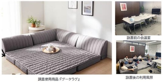 株式会社千趣会(本社:大阪市 代表取締役社長:梶原健司 以下千趣会)の通販事業ベルメゾンは、ラグと背もたれが一体化したローソファー『グータラグ』を社内の会議室に設置し、社内環境の変化がもたらす影響について2024年5月13日(月)から17日(金)にかけて実証実験を行いました。この会議室を利用し、実験に参加した従業員への調査結果によると、9割以上が「コミュニケーションがはかどる」「リラックスできる・落ち着く」と回答するなど、『グータラグ』の使用により快適さが向上したことが明らかになりました。