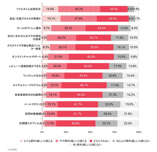 「とても便利/嬉しいと感じる」「やや便利/嬉しいと感じる」を合わせた割合で見ると、もっとも多いのは「リアルタイム在庫状況(60%)」。さらに、「返品・交換プロセスの簡便さ(56.6%)」、「セールのプッシュ通知(44.9%)」が続いています。