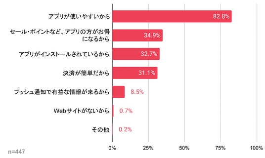 その理由としては、「アプリが使いやすいから」が82.8%。そのほか、「アプリのほうがお得になるから」や「インストールされているから」「決済が簡単だから」といった理由が続いています。つまり、ユーザーはアプリに対し使いやすさや利用するメリットを感じられれば、優先的にアプリを使用すると考えられます。
