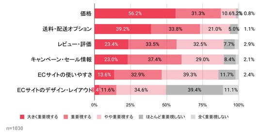ユーザーが大きく重要視すると回答した割合が多かったのは、「価格(56.2%)」や「送料・配送オプション(39.2%)」。逆に、「ECサイトのデザイン・レイアウト」については、ほとんど重視しない・全く重視していないことがわかりました。