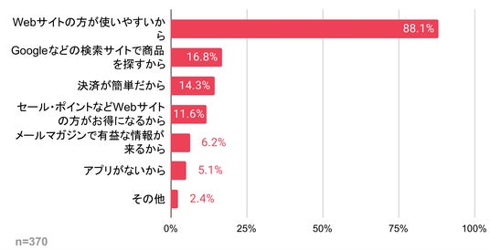 一方で、「Webサイトを優先して利用している」と回答した370名に対しその理由を尋ねると、「Webサイトのほうが使いやすいから」が88.1%と、アプリを優先的に利用する理由とほぼ変わらない結果になりました。
