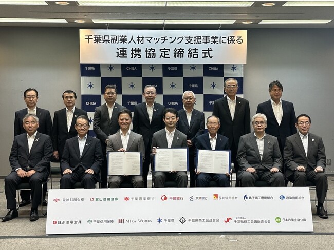 株式会社みらいワークス(本社:東京都港区、代表取締役社長 岡本祥治、以下「当社」)は、千葉県(知事 熊谷俊人)と、県内11金融機関(千葉銀行、京葉銀行、千葉興業銀行、千葉信用金庫、銚子信用金庫、館山信用金庫、佐原信用金庫、房総信用組合、銚子商工信用組合、君津信用組合、日本政策金融公庫)、及び2商工団体(千葉県商工会議所連合会、千葉県商工会連合会)と「副業人材マッチング支援事業」に係る連携協定を2023年7月19日に締結したことをお知らせいたします。今後、本協定を通じて、千葉県内の条件不利地域を含む7地域(※1)(香取、海匝、山武、長生、夷隅、安房、君津)の中小企業等での副業プロ人材の活用を推進することにより、地域経済活性化を目指します。