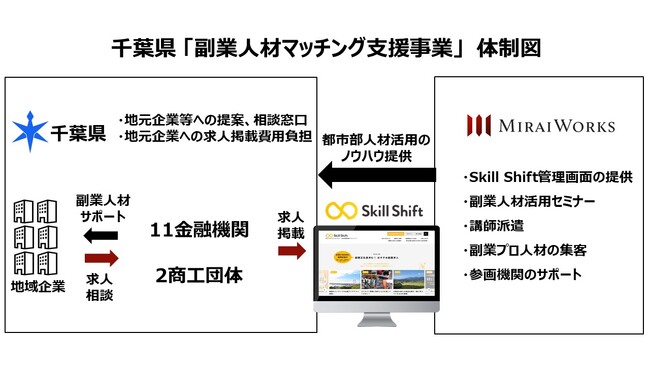 千葉県内11金融機関、2商工団体が、経営課題を抱える千葉県内7地域の企業に、『副業プロ人材の活用』をご紹介し、企業は経営課題を解決するための求人情報を『Skill Shift』に掲載します。千葉県は事業推進のために、本来、『Skill Shift』の利用にかかる求人掲載費用の全額を負担します。当社は、『Skill Shift』管理画面の提供、副業人材活用セミナーの開催、副業プロ人材の集客、副業プロ人材活性化のサポートを実施し、今後、本仕組みの定着・自走化を進めていくための足掛かりとして、プロジェクトをサポートいたします。