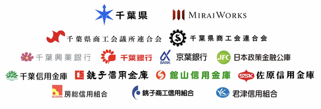前方の左から、銚子信用金庫 常勤理事 越川晴行、千葉信用金庫 理事長 宮澤英男、みらいワークス 代表取締役社長 岡本祥治、千葉県 知事 熊谷俊人、千葉県商工会連合会 会長 秦重悦、千葉県商工会議所連合会 専務理事 吉野毅、日本政策金融公庫千葉支店 支店長 井上周一郎(敬称略)