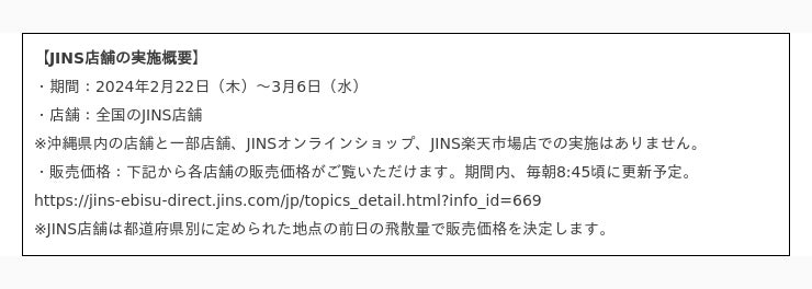 株式会社ジンズ(東京本社:東京都千代田区、代表取締役社長:田中亮、以下JINS)は、花粉・飛沫・乾燥対策メガネ「JINS PROTECT(ジンズ プロテクト)」の価格が、前日の花粉飛散量に応じて毎日変動するキャンペーン(https://www.jins.com/jp/protect/)を2024年2月22日(木)より3月6日(水)まで46都道府県のJINS店舗(沖縄県と一部店舗除く)で実施します。また本キャンペーンは移動式メガネ販売車「JINS GO」でも一部日程で実施します。