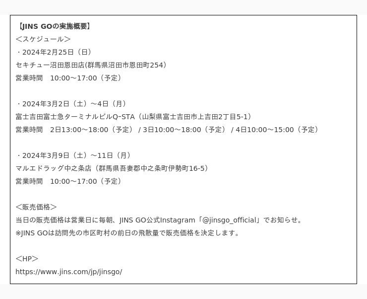 なお、JINS GOでは群馬県2か所でも本キャンペーンを実施。外出に足が重くなる時期だから、JINS GOが自ら商品もサービスもお届けに伺います。