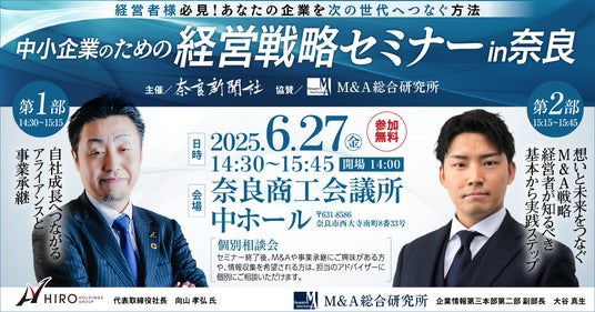 株式会社M&A総合研究所(本社:東京都千代田区、代表取締役社長:佐上 峻作、以下「当社」)は、2025年6月27日(金)に奈良県奈良市でM&A・事業承継に関するセミナーを開催いたします。