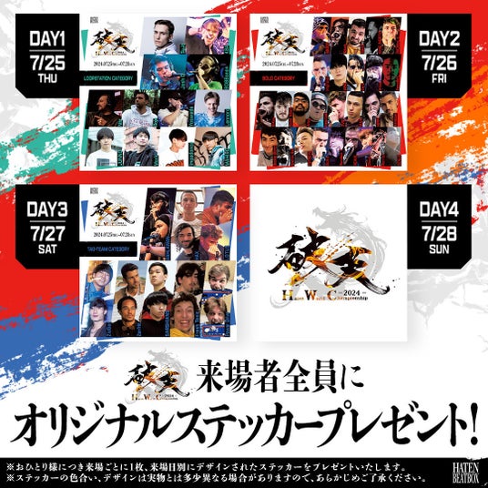 株式会社イザナギゲームズ(東京都江東区、プロデューサー兼CEO:梅田慎介)は、2024年7月25日(木)から7月28日(日)に開催される、日本初のBeatbox世界大会『Haten World Championship 2024』で、来場者限定オリジナルステッカーを無料プレゼントすることを発表いたしました。