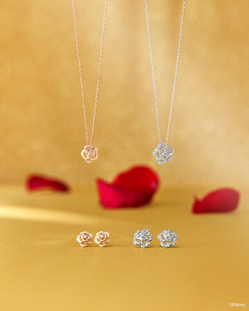 『美女と野獣』で物語のキーアイテムとなるバラをモチーフにしたネックレスとピアス。