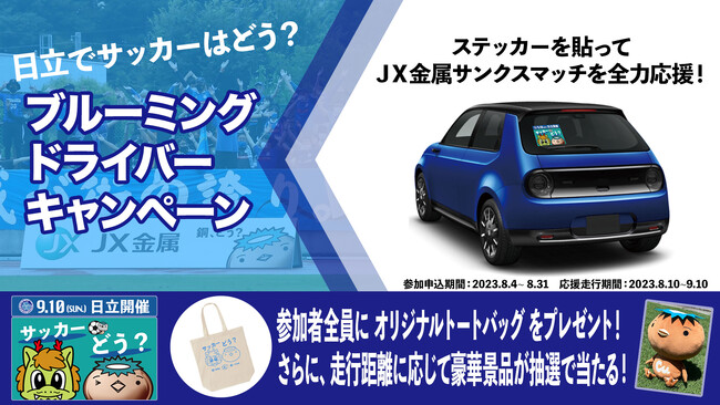 これは、株式会社チアドライブが運営する、一般ドライバーが愛車に好きなブランドや商品のステッカーを貼って走行することで企業を応援し、お礼として走行距離に応じた特典を得られるシェアリングエコノミーサービス「Cheer Drive」(チアドライブ)で、ドライバーが自家用車のリアウィンドウに応援ステッカーを貼り、いつものように運転することで『9月10日(日)日立開催のJX金属サンクスマッチ』をPRしていただきます。走行特典に参加いただいた方にはオリジナルトートバッグをプレゼント!さらに走行距離に応じて抽選で豪華景品が当たるチャンスもご用意しております。