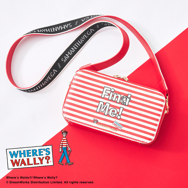 “Find Me!” のメッセージの下にサマンサベガのロゴプレートと「ウォーリー」をイメージした赤と白のボーダーデザインがポイント。