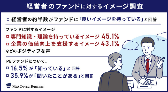 約半数の経営者がファンドに対して「良い」イメージを持つ。企業の事業承継先候補として存在感が増すPEファンドについて「知っている」と回答した人は2割弱と低い結果に
