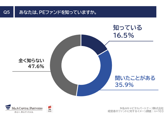 「Q5.PEファンドを知っていますか。」(n=103)と質問したところ、「知っている」が16.5%、「聞いたことがある」が35.9%という回答となりました。
