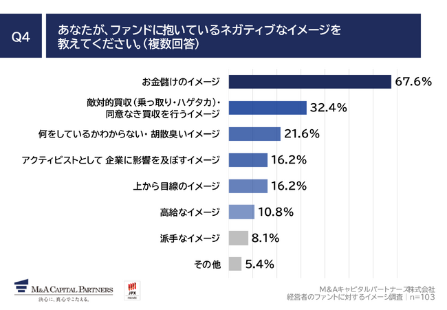 Q1で「悪い」「どちらかというと悪い」と回答した方に、「Q4.あなたが、ファンドに抱いているネガティブなイメージを教えてください。(複数回答)」(n=37)と質問したところ、「お金儲けのイメージ」が67.6%、「敵対的買収(乗っ取り・ハゲタカ)・同意なき買収を行うイメージ」が32.4%、「何をしているかわからない・胡散臭いイメージ」が21.6%という回答となりました。