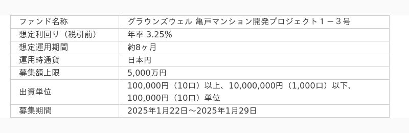 「未来をわかちあう投資」を提供する「Funvest(ファンベスト)」(以下、Funvest)は、「グラウンズウェル 亀戸マンション開発プロジェクト1-3号」(以下、本ファンド)の募集を1/22より開始しますので、お知らせいたします。