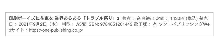 株式会社 ワン・パブリッシング(東京都台東区/代表取締役社長:廣瀬有二)は、2021年9月2日(木)に『印刷ボーイズに花束を 業界あるある「トラブル祭り」3』(定価:1430円/税込)を発売します。