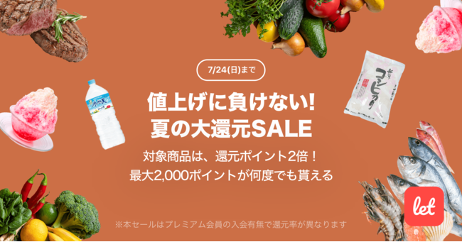 株式会社レット(本社:東京都港区、代表:佐藤 航陽)が運営する、食品ロス/在庫ロス削減のマーケット「Let(レット)」内で「値上げに負けない!夏の大還元SALE」を7月22日(金) 18:00より開催します。期間中、プレミアム会員様限定で対象の食品をご購入いただくと、2,000ポイントを上限に還元ポイントが2倍になります。期間中のご購入であれば、ポイント還元はお一人様あたり何度でもご利用いただけます。