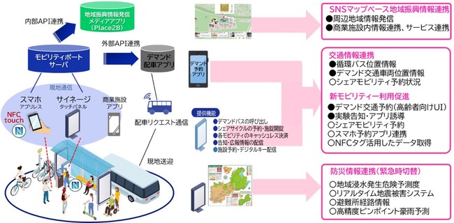 「DNPモビリティポート」は、住民や観光客、高齢者や若者等の誰にとっても、多様な交通手段が利用しやすい環境をつくり、周遊を促す“移動最適化サービス”です。今回の共同研究では、商業施設に「DNPモビリティポート」のコミュニケーション端末を設置し、デマンド乗合いタクシーの手配や周辺地域情報の発信により、住民等の利便性向上を図ります。また、商業施設の店舗等の広告やクーポンサービスと連動することで、地域のにぎわいづくりに対する効果を検証します。共同研究の結果は、今後の同地域での高蔵寺スマートシティプロジェクトに反映していく予定です。