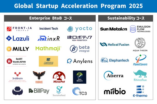 本年度の第一弾として、全国から選出されたEnterprise BtoB領域およびサステナビリティ領域の日系スタートアップ30社の採択を決定しました。各企業は、世界有数のアクセラレーターと連携したプログラムに参加し、海外展開に向けた実践的な支援を受けます。