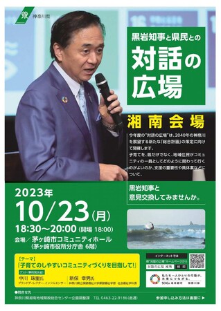 令和5年10月23日(月曜日)18時30分から、茅ヶ崎市コミュニティホールで、「子育てのしやすいコミュニティづくりを目指して!」をテーマに、黒岩知事と県民との"対話の広場"【湘南会場】を開催します。
