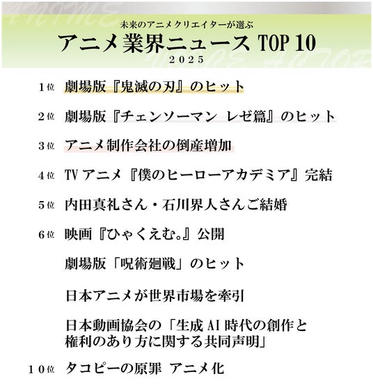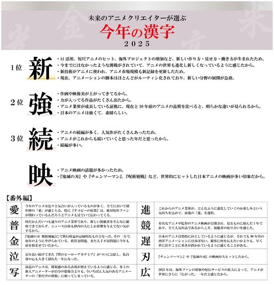 本調査では、アニメ演出、アニメーター、声優、3DCGなど、将来アニメ業界での活躍を目指す学生を対象に、2025年のアニメ業界で印象に残ったニュースや衝撃を受けた作品、ならびに「2025年のアニメ業界を表す漢字」について回答を収集しました。