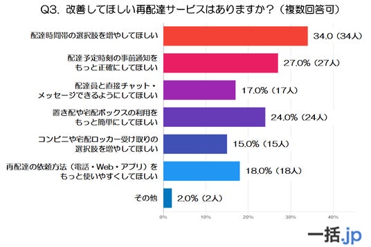 - 最も多かったのは「配達時間帯の選択肢を増やしてほしい」で、全体の34.0%(34人)を占めました。受け取りの利便性を高めるため、柔軟な時間指定を求める声が強いことが分かります。