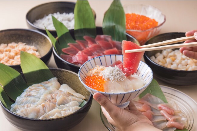 また、甘味のある上品な味わいが特徴のあご出汁をかけてお召し上がりいただく海鮮出汁茶漬けも美味。あご出汁が魚の旨味を一層引き立て、海鮮丼とはまた違った美味しさが味わえます。