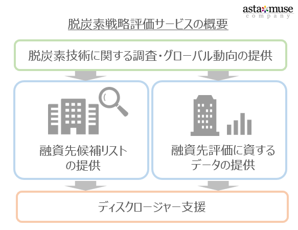 アスタミューゼ株式会社(本社:東京都千代田区、代表取締役社長 永井歩)は、法人融資向け「脱炭素戦略・評価支援サービス」を開始します。非財務情報を分析することで、これまで融資判断に取り入れることが難しかった企業の成長側面、気候変動における事業機会を評価する支援をします。