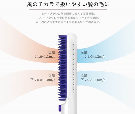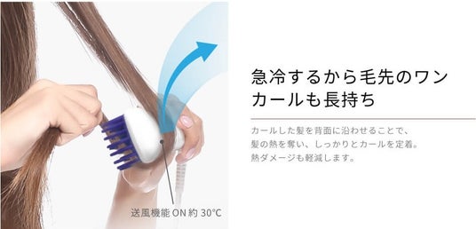 他のブラシアイロンとの大きな違いは『送風機能』にあり、設定温度に達するとブラシ面からの温風でピンが届きにくい部分にも熱を伝え、根元からのスタイリングを可能に。熱を伝えた髪を背面からの冷風で素早く冷ますことでアイロンでつけたクセの持続力を上げ、キューティクルを引き締めてツヤを引き出します。