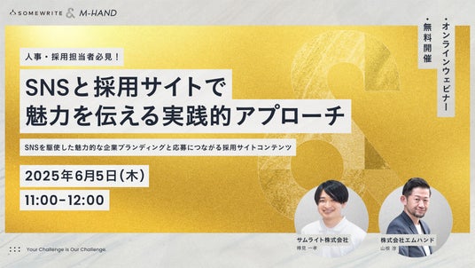 企業のコンテンツマーケティングやメディアビジネス等を支援するサムライト株式会社(本社:東京都港区、代表取締役社長:池戸 聡、以下「サムライト」)は6月5日(木)11時より、無料オンラインセミナー「人事・採用担当者必見!SNSと採用サイトで魅力を伝える実践的アプローチ」を開催いたします。