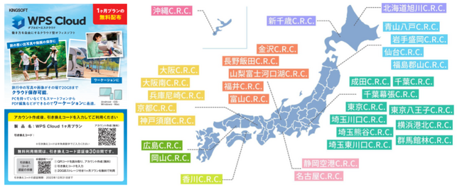 2023年5月18日現在で、全国34営業所(新千歳・旭川・青森八戸・岩手・福島・埼玉・新宿・渋谷・品川・上野・恵比寿・両国・二子玉川・八王子・武蔵小杉・横浜・成田・静岡・愛知・京都・大阪・神戸・岡山・広島・香川・沖縄など)、89貸渡拠点のキャンピングカーレンタル事業拠点を持つ「ジャパンキャンピングカーレンタルセンター」にて、キャンピグカーレンタルをご利用の方にWPS Cloudの1ヶ月プランの無料引き換えコード付きライセンスカードを配布します。※ライセンスカードが無くなり次第終了いたします
