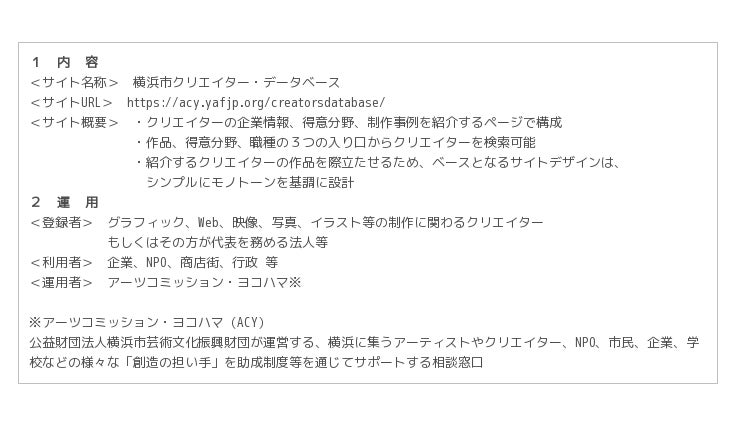 このたび、集積したクリエイターの情報を発信し、市内の事業につなぐなど、新たなビジネスチャンスを創出するため、クリエイターの紹介・検索機能に優れたサイト「横浜市クリエイター・データベース」を立ち上げ、5月12日から運用を開始しました。