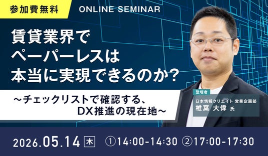 不動産テックを推進する日本情報クリエイト株式会社(本社:宮崎県都城市、代表取締役社長:辻村 都雄、証券コード:4054)は、2026年5月14日(木)に無料オンラインセミナー「 賃貸業界でペーパーレスは本当に実現できるのか?~チェックリストで確認する、DX推進の現在地~ 」を開催いたします。