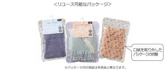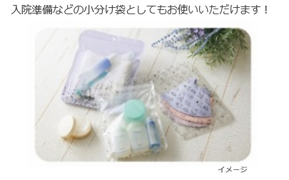 商品パッケージは、イラストが描かれたジップ付きのパッケージで、入院準備などの小分け袋としても活用できます。お使いいただきやすいよう、商品に関する情報は取り外し可能な口紙に記載しました。(品質表示は商品本体についています。)