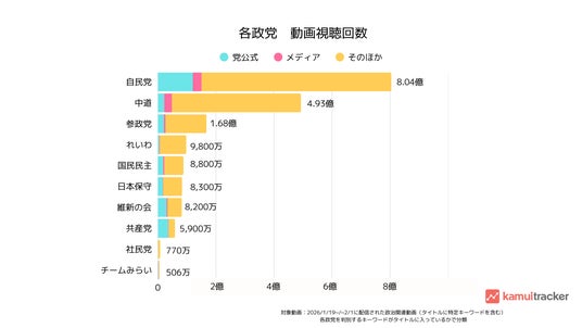 株式会社エビリー(本社:東京都渋谷区、代表取締役社長:中川恵介、以下エビリー)は、当社が提供するYouTubeデータ分析ツール『kamui tracker(カムイトラッカー)』を用い、衆議院の解散が宣言された2026年1月19日から2月1日までの期間において、YouTube上に投稿された政党関連動画の投稿本数および視聴回数、エンゲージメント(コメントといいねの総数 熱量がわかる)、コメント等を独自に集計・分析いたしました。
