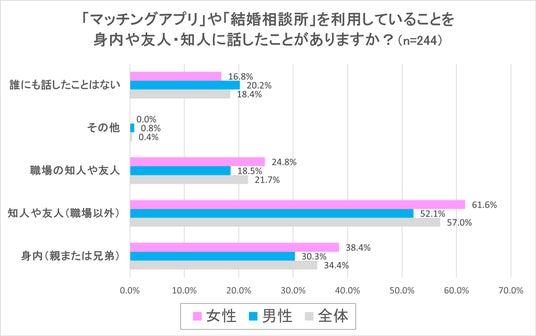 次の設問では「マッチングアプリ」「結婚相談所」を利用した経験があると回答した244人に、利用していることを身内や知人に話したことがあるかどうかについて質問しました。結果は全体で18.4%が「誰にも話したことはない」という一方で、全体の81.6%が身内(親または兄弟)あるいは知人や友人に話をした経験があるという調査結果となりました。