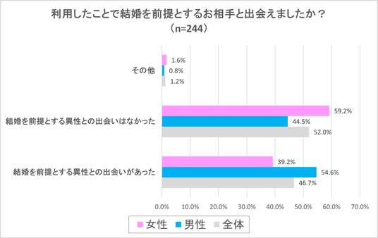 最後の設問では、「利用した経験がある」という回答した244人に対して、「結婚を前提とする異性との出会いがあったかどうか?」について質問をいたしました。