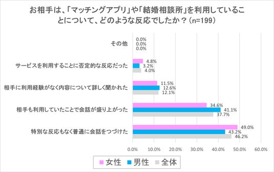 最も多かった回答は「特別な反応もなく普通に会話を続けた」が全体で46.2%という結果で、男女ともに大きな差異はみられない結果となりました。続いて2番目に多かった反応として、男女ともに「相手も利用していたことで会話が盛り上がった」が全体で37.7%という結果となり、こちらも男女間で回答割合に大きな差異はない結果となりました。これらの上位2つの回答で83.9%となったことから、マッチングアプリや結婚相談所を利用していることについては、知人・友人、そして身内(親または兄弟)との会話の話題の一つとしてある程度定番の話題として定着しているという事がいえる状況なのかもしれません。また、回答の選択肢にある「否定的な反応だった」という回答割合が全体で4.0%ということからも、異性との出会いの方法の一つとしてこれらのサービスの利用が広く認知されていることがうかがえる調査結果となりました。