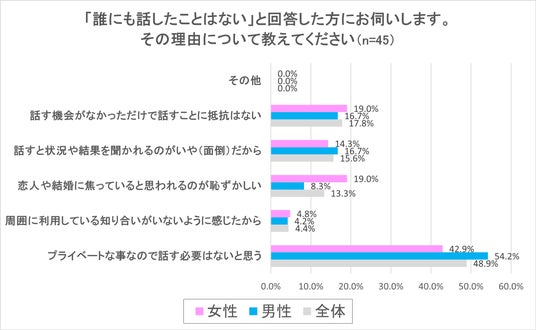「誰にも話したことはない」と回答した45人にその理由が何かを質問した結果、最も回答が多かったのは「プライベートな事なので話す必要はないと思う」の回答割合が全体で48.9%となり、男性は54.2%、女性は42.9%という結果となり、女性より男性の方がプライベートな内容を周囲に共有することをしない傾向があるということがうかがえる結果となりました。